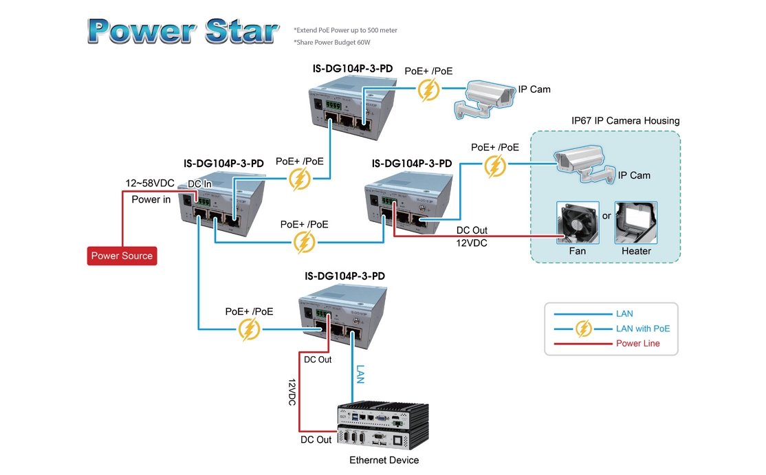 The IS-DG104P-3-PD Series are rugged designed, high power, Gigabit Ethernet industrial PoE Injector which meets IEEE 802.3af/at standard with 15.4/30/36 watts output and up to 57 watts high power output(PSB port). The IS-DG104P-3-PD Series are especially good for your security system application. The special cold design technology will not only power up your PD device, but also reduce the excessive heat problem to a minimum. The IS-DG104P-3-PD Series accept the input voltage from 12 to 58 VDC and have been rigorously tested for your Security, Transportation and all the other Industrial applications.